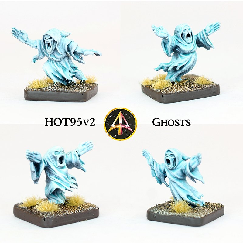 HOT95v2 Ghosts: This code contains ten evenly mixed 15mm scale metal miniatures in four poses. For those who love their tabletop battles with a generous dose of the macabre Ghosts are a must have. Shown in our photos on 20mm Square Bases they are approx 18mm tall. As with all HOT codes you can have a pack or a ‘sampler’ giving you one of each pose in the pack; a great way to get skirmish forces. Use with codes such as HOT41 Skeleton Spears and HOT129 Mummies.