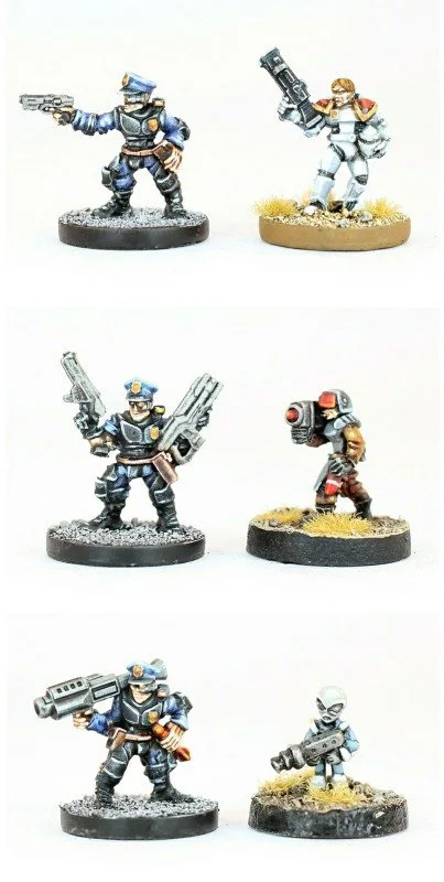 The HOF Range is well suited to any rules system in 15mm scale. Browse the massive selection of Security Force Alpha (SFA), the Grey Aliens, Cultists, Post Apoc Warriors, Octopod Aliens, Robot Automata, Zidhe Space Elves, Corporate Ashigaru, Rim Mercs plus Lemurians (Ancient Lionmen), Star Mercs and several oddities too. Above you can see the OmniCops attempting to arrest of HOF206 Bounty Hunters who have stepped over the line into crime!