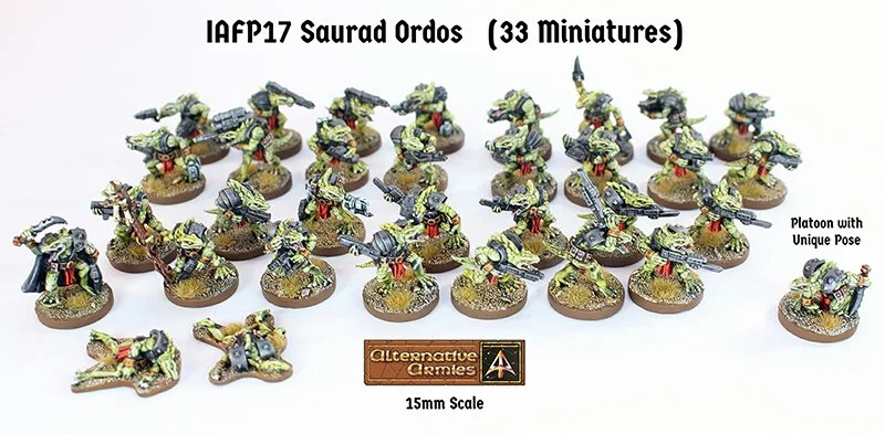 IAFP17 Saurad Ordos (Platoon Pack) - Includes free extra unique miniature! This code contains everything from IAF192, IAF193, IAF194 and IAF195 and the kneeling Saurad Tracker. You can also get the tracker on its own on that page.