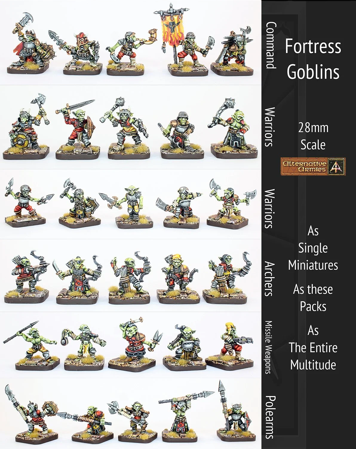 Each is a character in its own right and ideal for dungeon crawl or serried ranks upon the field of battle. Thirty different poses of Warriors, Polearms, Archers, Missile Weapons and Command. See them in codes OH37 to OH42 in the Goblin and Orc Horde Range.